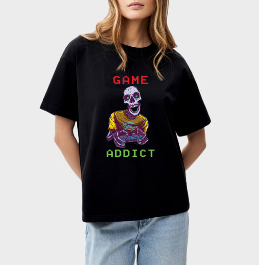 Women's Oversized Graphic Printed Premium Black Cotton Biowash T-Shirt - Game Addict Graphic Unisex Tee