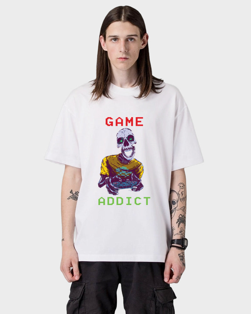 Elevate your gaming style with our Unisex Oversized Graphic Printed Premium Cotton Biowash T-Shirt, featuring a captivating skeleton playing a game graphic and the words "Game Addict" boldly displayed. This t-shirt seamlessly combines premium quality and gaming passion.