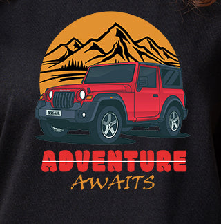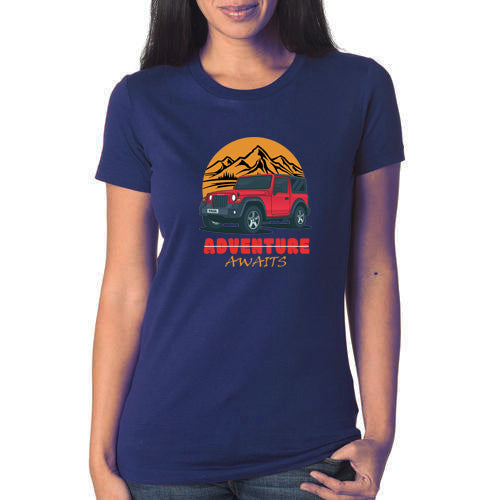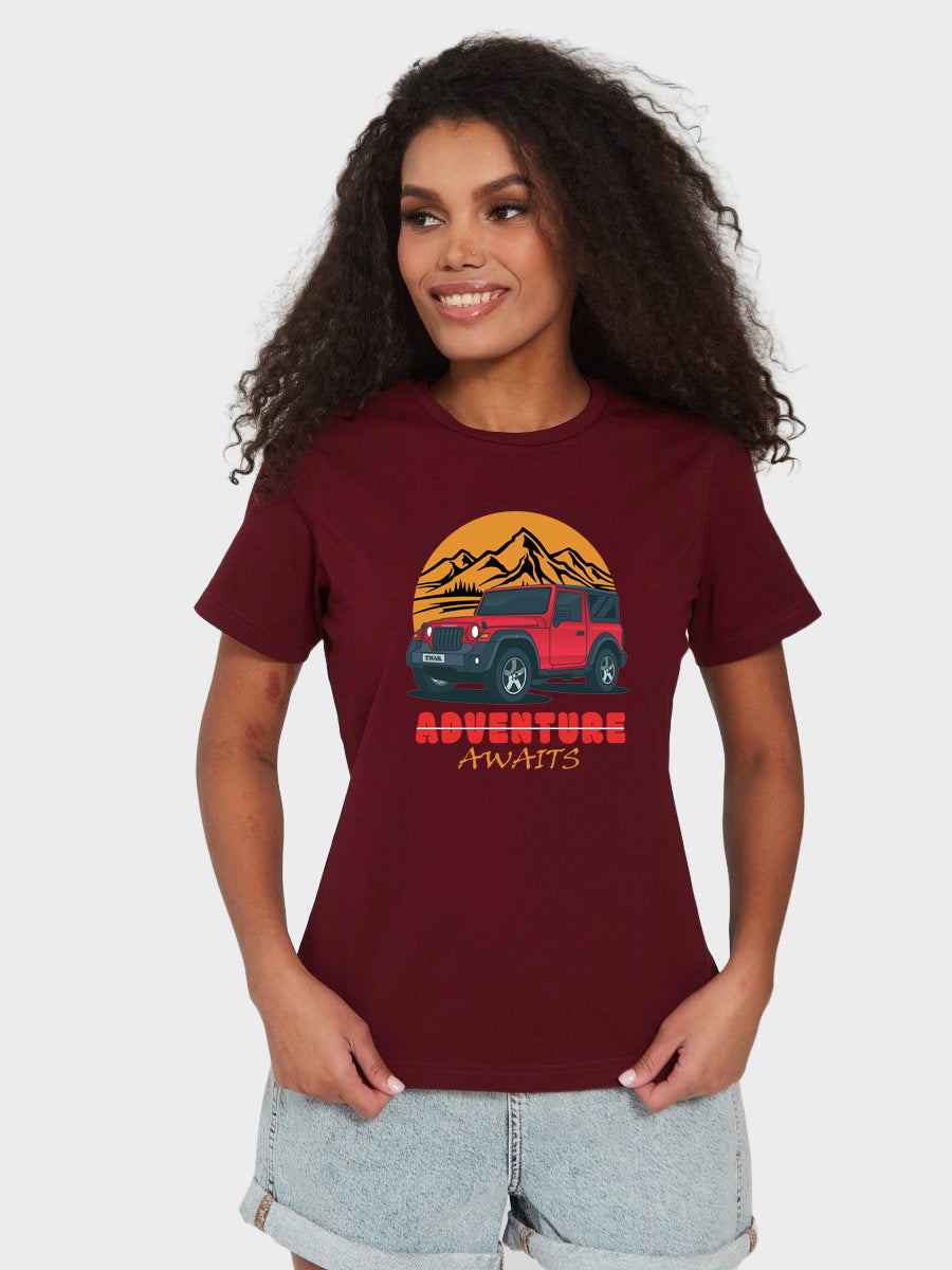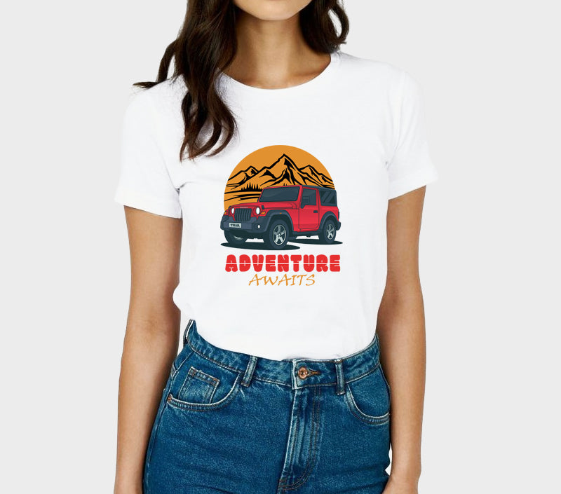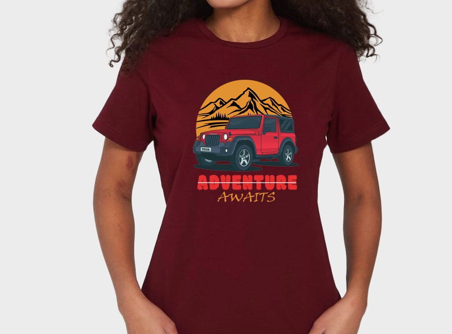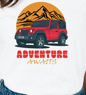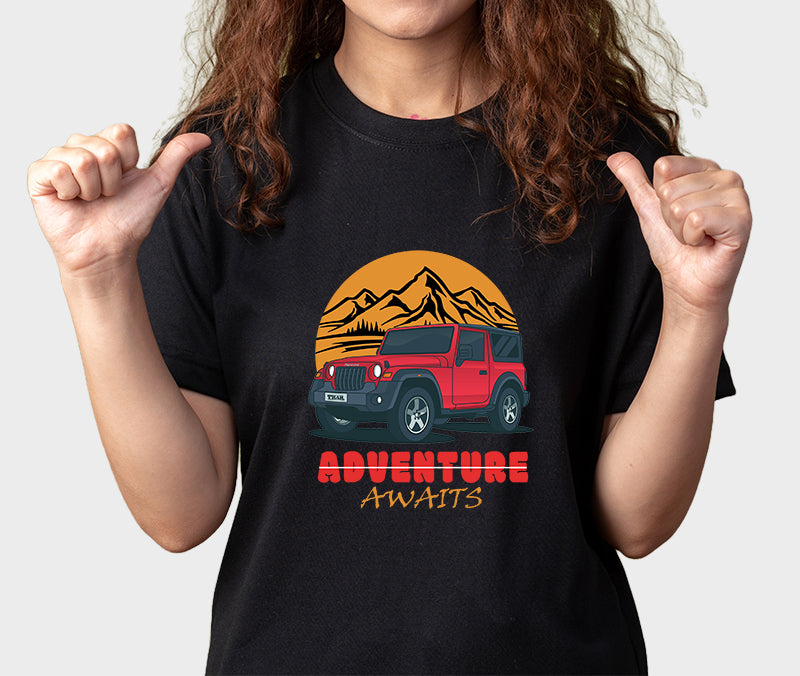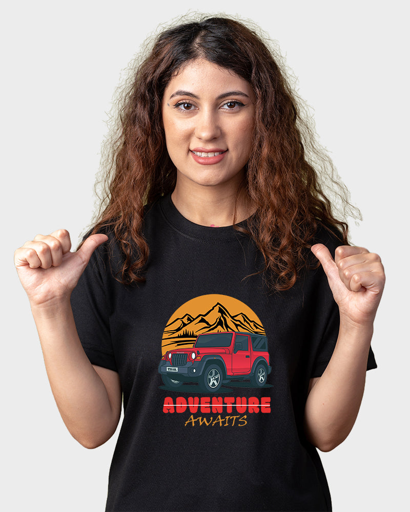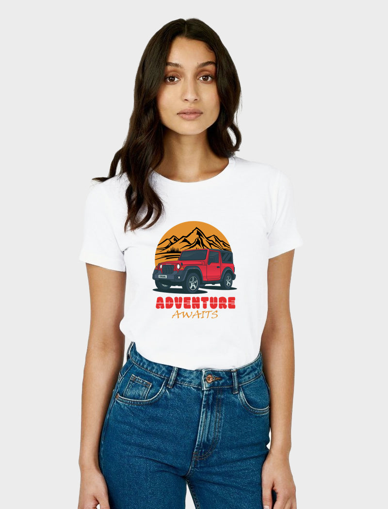 Embark on a style journey with Women's Premium Cotton Biowash Graphic T-Shirt, featuring the captivating message "Adventure Awaits" alongside a detailed Mahindra Thar graphic. Crafted for comfort and style enthusiasts, this t-shirt seamlessly blends premium quality and a sense of wanderlust.