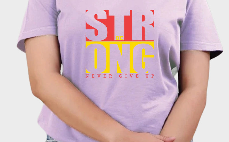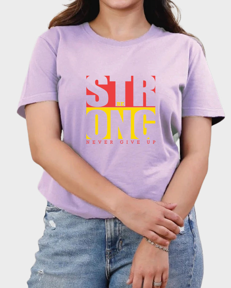 Introducing Women's "Be Strong Never Give Up" Typography Cotton T-Shirt in Lavender Color. Embrace the message of resilience and determination with this motivational tee.